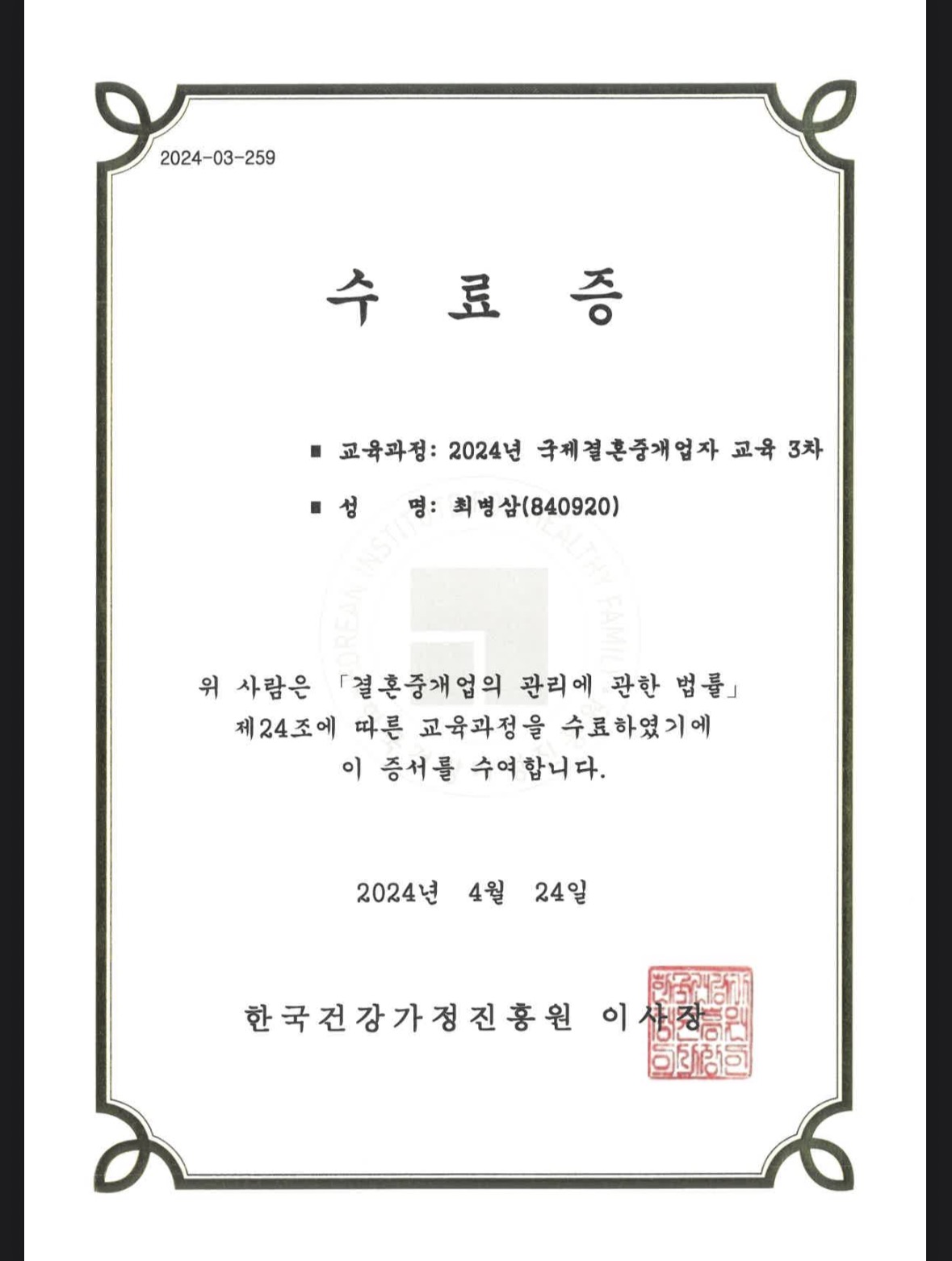 세부내용: 신부가 한국에 입국한 이후, 현지에서 진행된 모든 서비스와 약속된 항목들을 최종 확인한 뒤 잔금을 납부합니다. 입국 후 절차에 따른 비자·서류 정리와 추가 교육(한국어 등)이 진행됩니다.